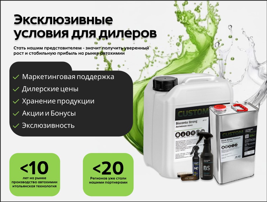 Интернет-магазин товаров для детейлинга Custom Store предлагает автохимию, автокосметику и оборудование для автомоек. Мы продаем товары, которые помогут профессиональным детейлерам, автомойщикам, владельцам автомобилей, спецтранспорта и мототехники поддерживать красивый вид транспортных средств, близкий к заводскому состоянию. Ухоженные машины приятно выделяются в дорожном потоке, привлекают внимание, их проще продать на вторичном рынке.